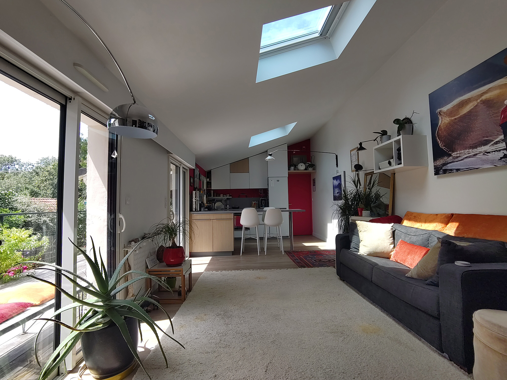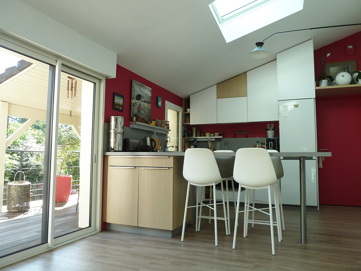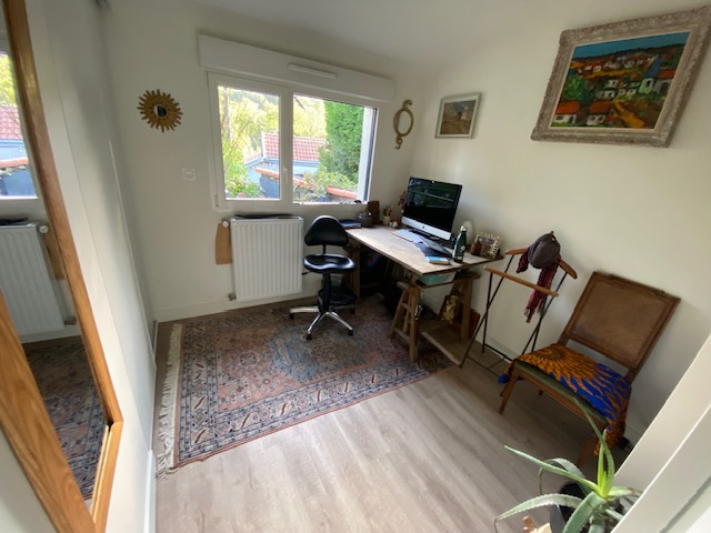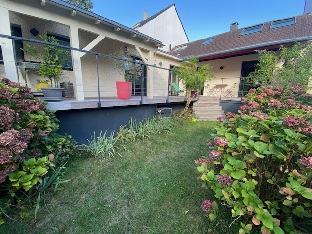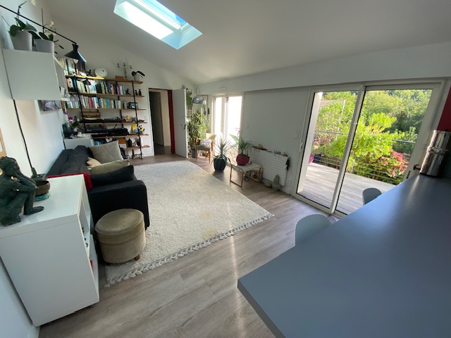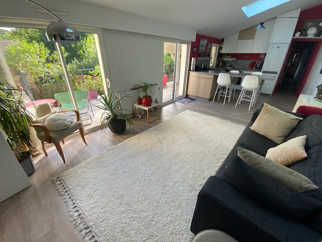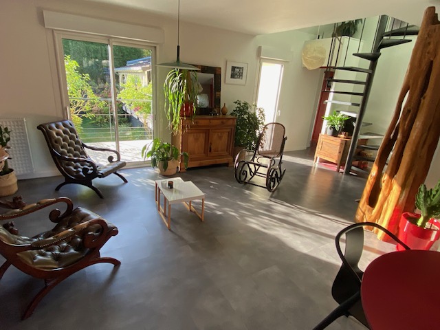 Nantes, au calme dans la vallée du Cens, à proximité du Petit Port, des commerces et des transports, jolie maison atypique rénovée de 110 m² (138 m² au sol) avec entrée, salon traversant de 31 m², salle à manger avec cuisine ouverte aménagée équipée, w.c, une chambre de 11 m², un bureau de 7 m², une salle d’eau avec w.c ; à l’étage : une salle de bains avec w.c, 2 chambres mansardées. DPE C chauffage individuel gaz.